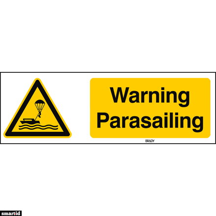 Výstražná bezpečnostní tabulka Brady® z odolného hliníku (450 × 150 mm) v provedení černá na žluté s ikonou parasailingu. Určena pro jasnou identifikaci a varování před parasailingem dle normy ISO. Ideální pro použití v námořním prostředí, přístavech, lodích i průmyslových zařízeních. Trvanlivé provedení odolává povětrnostním vlivům, UV záření a korozi. Snadná instalace na stěny či konstrukce. Vhodná pro mezinárodní využití, text v angličtině.