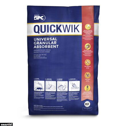 Absorpční granulát QUICKWIK™ Universal od Brady® SPC® nabízí více než 4× vyšší absorpční schopnost než běžné jílové sorbenty. Je vyroben z kokosového vlákna a je ideální pro rychlý úklid průmyslových úniků, rozlití i kapalin. Neobsahuje karcinogeny ani nezpůsobuje prašnost, a tím zajišťuje bezpečnější a čistší pracovní prostředí. Balení 50 litrů, rozměry 33 × 58 cm.