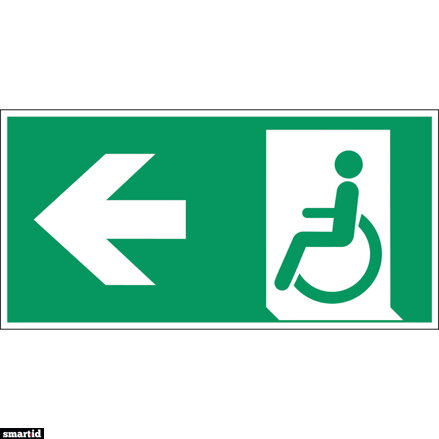 Bezpečnostní značka ISO – Nouzový východ pro osoby s omezenou pohyblivostí (vlevo). Značení určuje únikovou cestu do bezpečí pro osoby neschopné chůze nebo s pohybovým omezením. Vysoce viditelná bílá grafika na zeleném podkladu, rozměr 400 × 200 mm, odolný laminovaný polyester. Ideální pro nemocnice, veřejné budovy a zařízení vyžadující přístupnost pro hendikepované osoby.